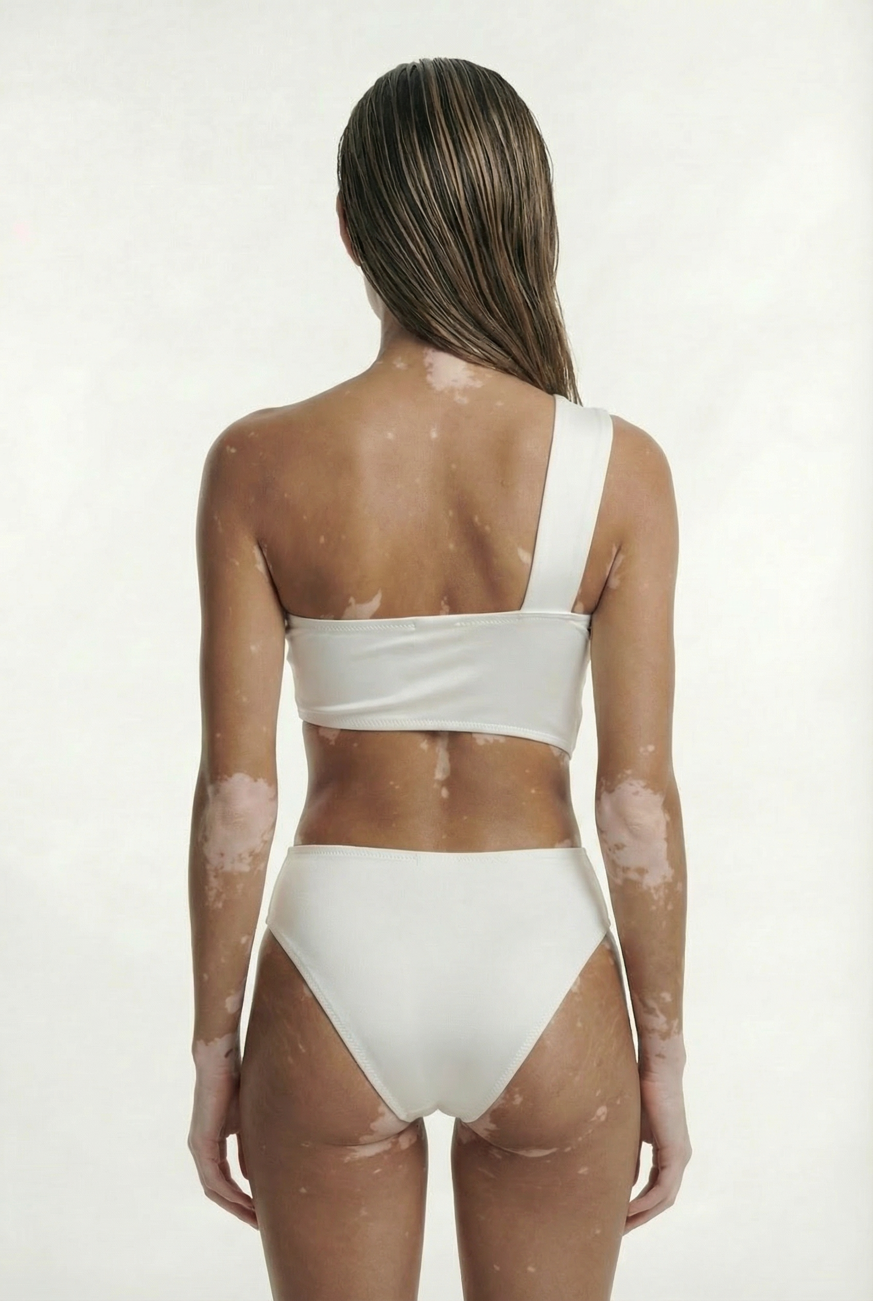 Bikini de dos piezas unidas por un aro en acero inoxidable ligeramente brillante satinado, tira ancha de ubcación irregular y tela con protección UV.