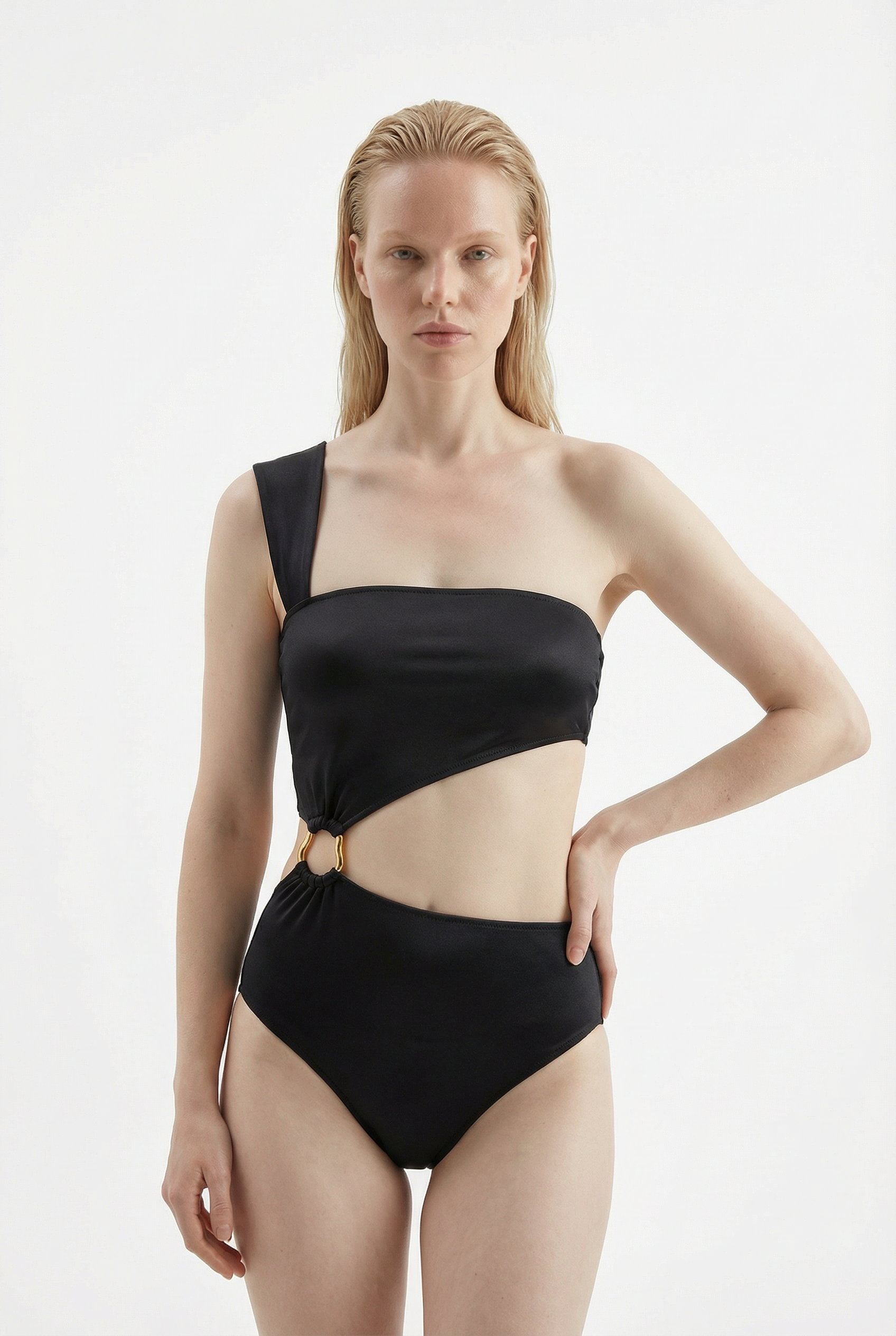 Bikini de dos piezas unidas por un aro en acero inoxidable ligeramente brillante satinado, tira ancha de ubcación irregular y tela con protección UV.